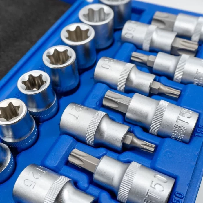 1/2″ İç-Dış Torx Lokma Anahtar Takımı 19 Parça Mat krom kaplı 19 parçadan oluşan 1/2″ lokma kolllarında kullanabileceğiniz torx E-lokma ve torx bit lokma takımıdır. Daha fazla dayanıklılık için krom vanadyum çelikten imal edilmiştir, Plastik taşıma kutusu ile birlikte, 100% yepyeni ve yüksek kalite, Malzeme krom vanadyum çeliği (Cr-V). 1/2″ Soketli Dış Torx: E10 E11 E12 E14 E16 E18 E20 E22 E24 (Toplam uzunluk 38 mm) 1/2″ Soketli İç Torx Bits: T20 T25 T27 T30 T40 T45 T50 T55 T60 T70 (Toplam uzunluk 55 mm)